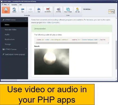 You can not only use HTML5, JavaScript, but also video and audio resources embedded into the EXE or kept externally. Build media-rich apps or even HTML5 games.