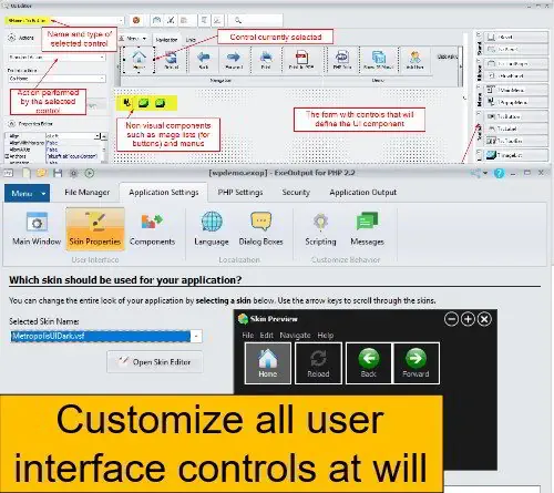 Design modern and complex user interfaces with the visual drag-drop editor. Easily change the entire look of your PHP GUI application thanks to skin support.